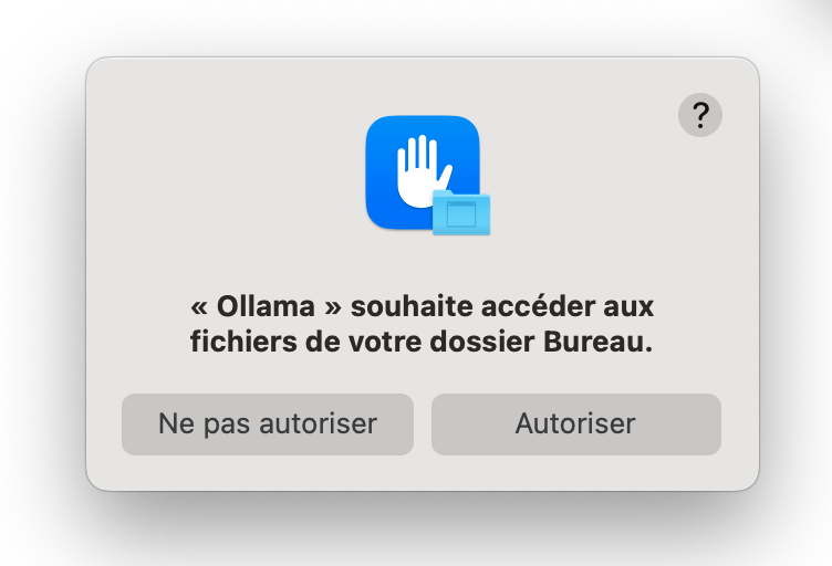 Et si votre fichier était sur le bureau, macOS va aussi vous demander d'autoriser Ollama à accéder aux fichiers sur le bureau pour qu'il puisse se déplacer lui-même dans le dossier Applications.