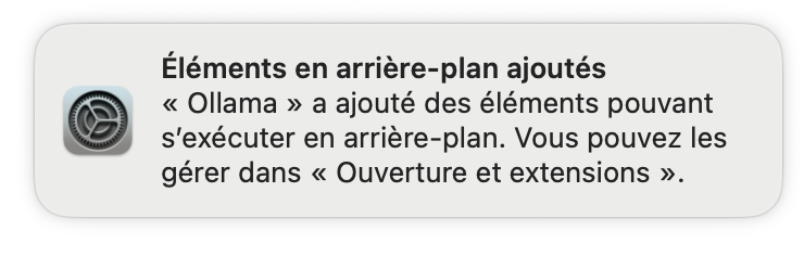 macOS vous indique également qu’Ollama a ajouté des éléments pouvant s’exécuter en arrière-plan.