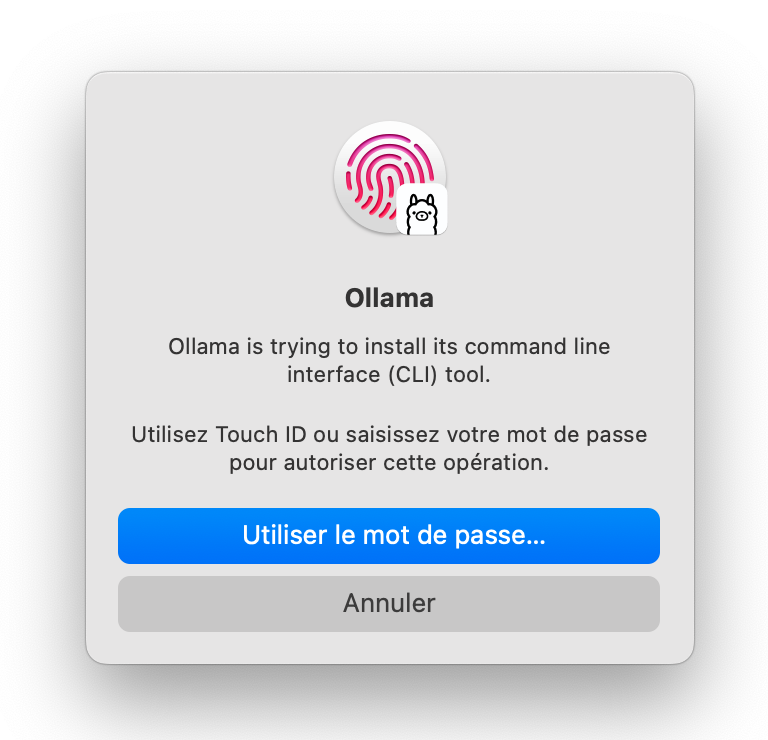 Si Ollama n’a pas été déplacé dans le dossier Applications, un message en anglais vous proposera de le faire automatiquement.